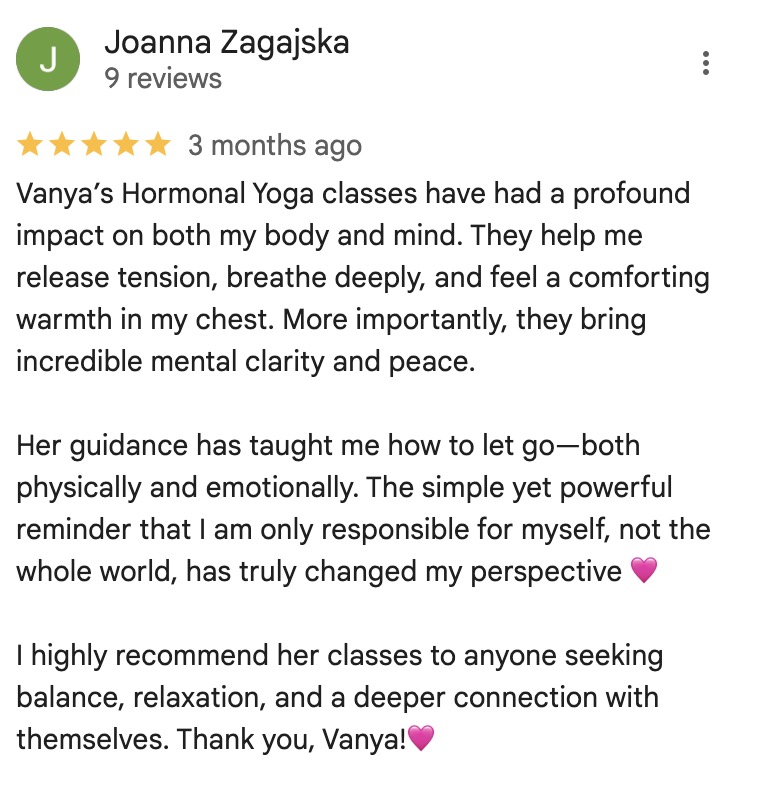 Joanna found that Hormone Yoga classes brought her "incredible mental clarity and peace" along with physical tension relief. The practice taught her to let go emotionally and reminded her she's only responsible for herself, not the whole world.