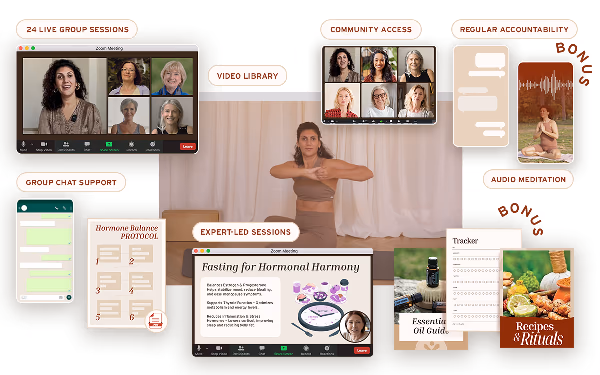 - Supporting materials (Hormone Balance Protocol, Progress Tracker, Ayurvedic Recipes & Essential Oil Guide)